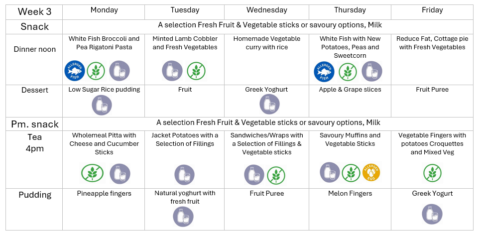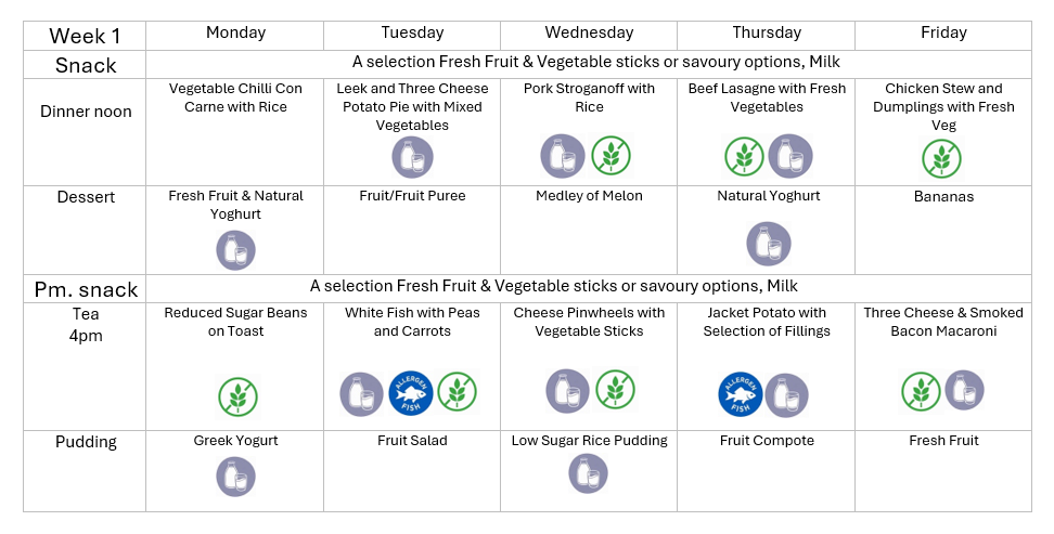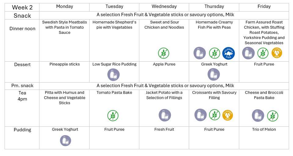 All our meals are well balanced, nutritious and varied and freshly prepared each day on the premises by our own qualified cook. At lunchtime, we offer a hot main meal and pudding alongside a light tea later in the afternoon.